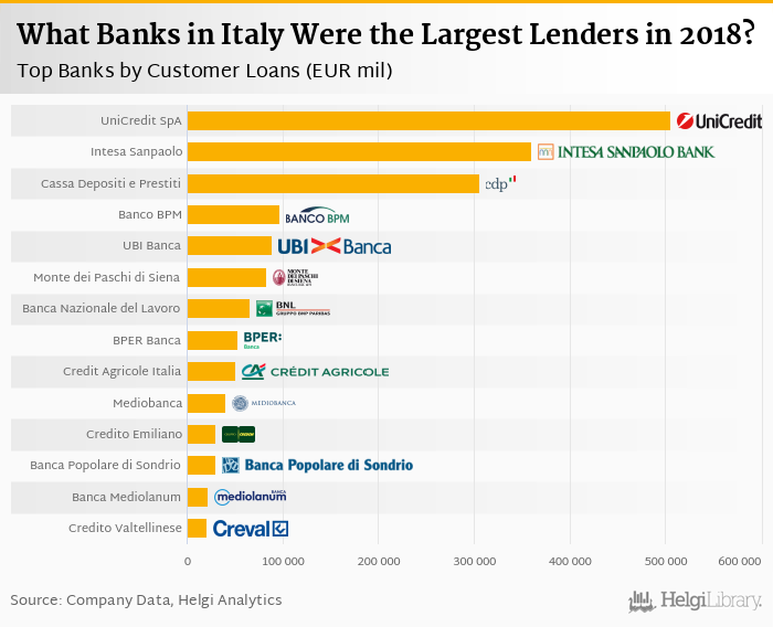 Based on a comparison of 14 banks in Italy in 2018, UniCredit SpA was the largest lender, followed by Intesa Sanpaolo and Cassa Depositi e Prestiti.
