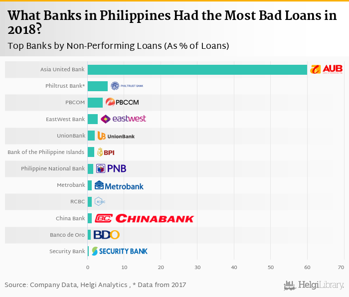 Based on a comparison of 12 banks in Philippines in 2018, Asia United Bank had the highest share of bad loans, followed by PBCOM and EastWest Bank.