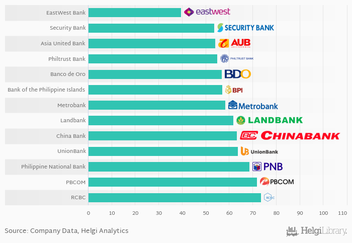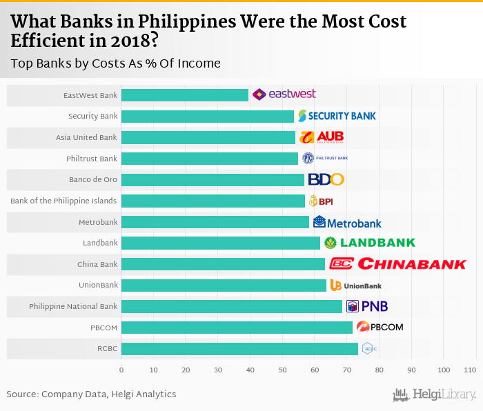 Based on a comparison of 13 banks in Philippines in 2018, EastWest Bank was the most cost efficient bank, followed by Security Bank and Asia United Bank.