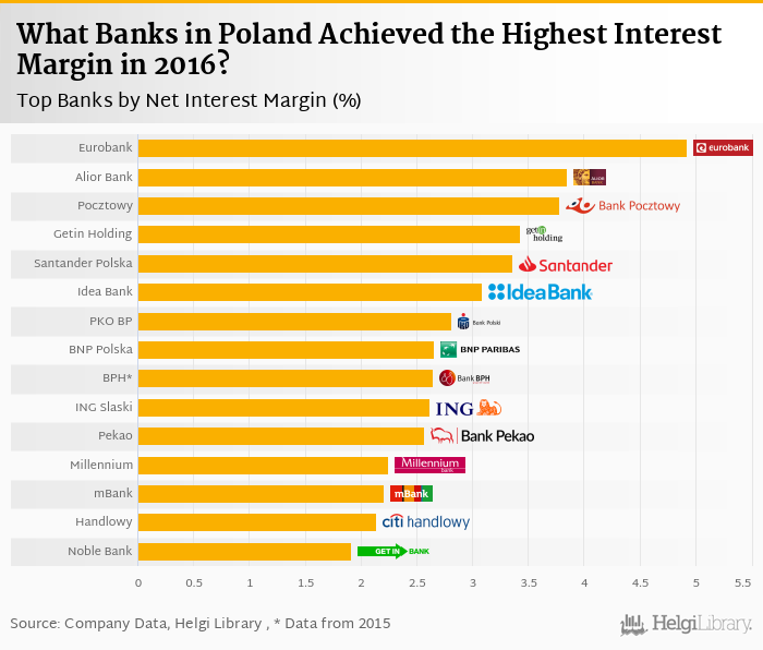 Based on a comparison of 18 banks in Poland in 2016, Eurobank Poland operated with the highest net interest margin, followed by Alior Bank and Bank Pocztowy.
