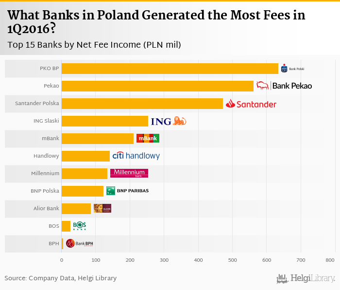 Based on a comparison of 11 banks in Poland in 1Q2016, PKO BP generated the largest fee income, followed by Pekao and Santander Bank Polska.