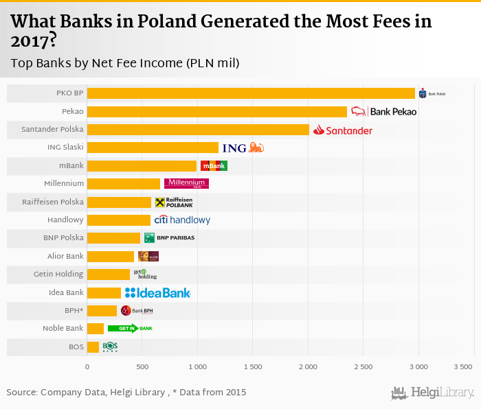 Based on a comparison of 18 banks in Poland in 2017, PKO BP generated the largest fee income, followed by Pekao and Santander Bank Polska.