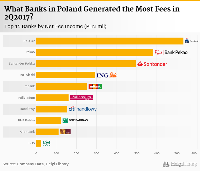 Based on a comparison of 11 banks in Poland in 2Q2017, PKO BP generated the largest fee income, followed by Pekao and Santander Bank Polska.