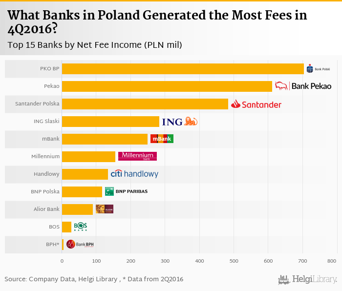 Based on a comparison of 11 banks in Poland in 4Q2016, PKO BP generated the largest fee income, followed by Pekao and Santander Bank Polska.