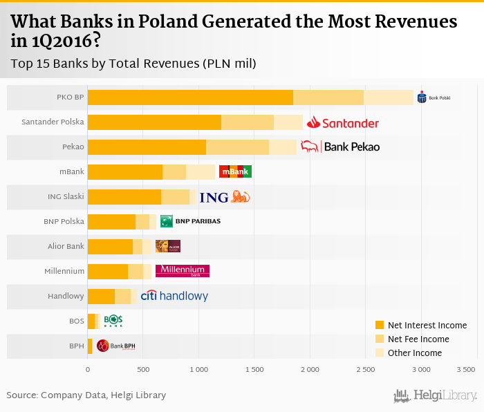 Based on a comparison of 11 banks in Poland in 1Q2016, PKO BP generated the largest revenues, followed by Santander Bank Polska and Pekao.