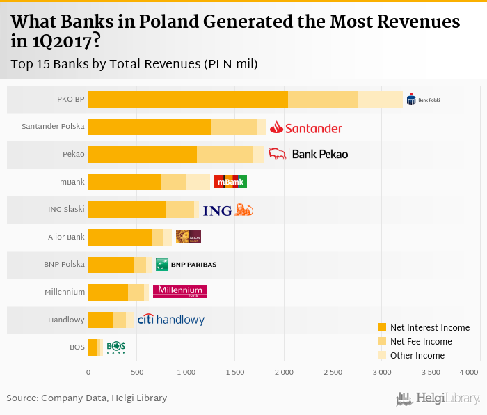 Based on a comparison of 11 banks in Poland in 1Q2017, PKO BP generated the largest revenues, followed by Santander Bank Polska and Pekao.