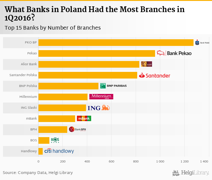 Based on a comparison of 11 banks in Poland in 1Q2016, PKO BP had the most branches, followed by Pekao and Alior Bank.