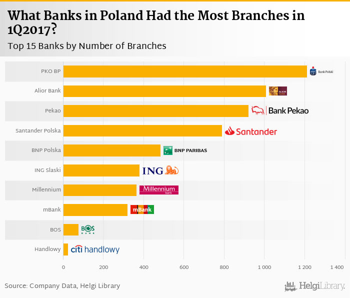 Based on a comparison of 11 banks in Poland in 1Q2017, PKO BP had the most branches, followed by Alior Bank and Pekao.