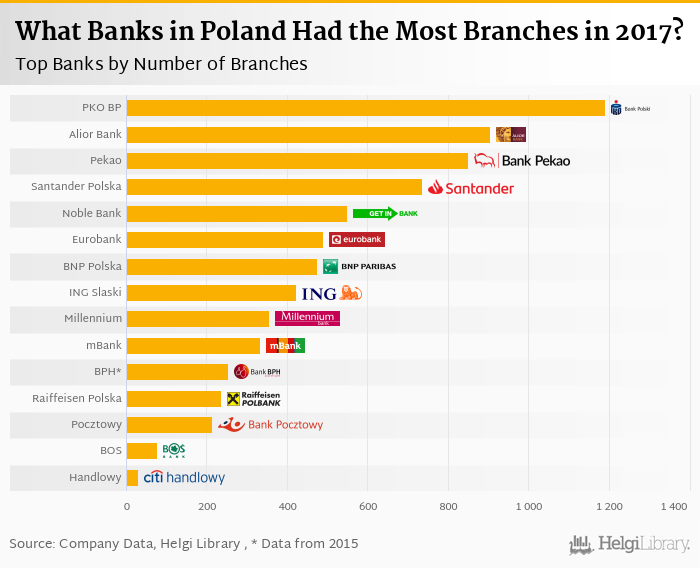 Comparing PKO BP with its closest peers, Alior Bank operated a network of 905 branches in 2017, Pekao had 851 branches and Santander Bank Polska had a network of 735 branches in 2017.