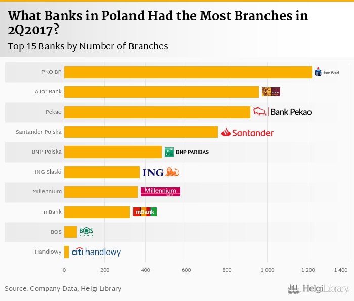 Based on a comparison of 11 banks in Poland in 2Q2017, PKO BP had the most branches, followed by Alior Bank and Pekao.