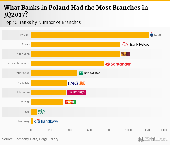 Based on a comparison of 11 banks in Poland in 3Q2017, PKO BP had the most branches, followed by Pekao and Alior Bank.