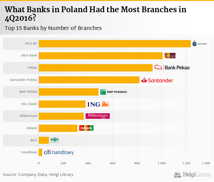 Based on a comparison of 11 banks in Poland in 4Q2016, PKO BP had the most branches, followed by Alior Bank and Pekao.