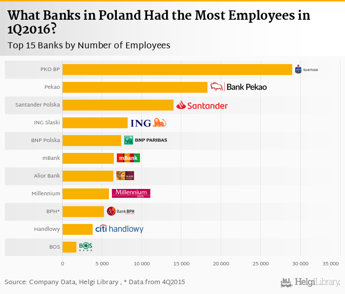 Based on a comparison of 11 banks in Poland in 1Q2016, PKO BP had the most employees, followed by Pekao and Santander Bank Polska.