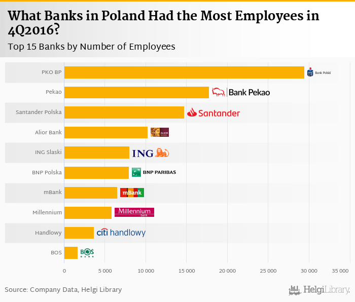 Based on a comparison of 11 banks in Poland in 4Q2016, PKO BP had the most employees, followed by Pekao and Santander Bank Polska.