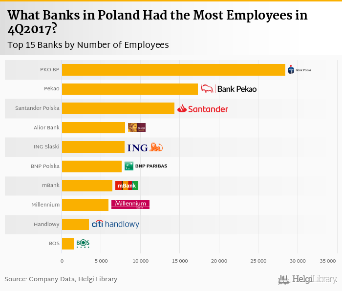 Based on a comparison of 11 banks in Poland in 4Q2017, PKO BP had the most employees, followed by Pekao and Santander Bank Polska.