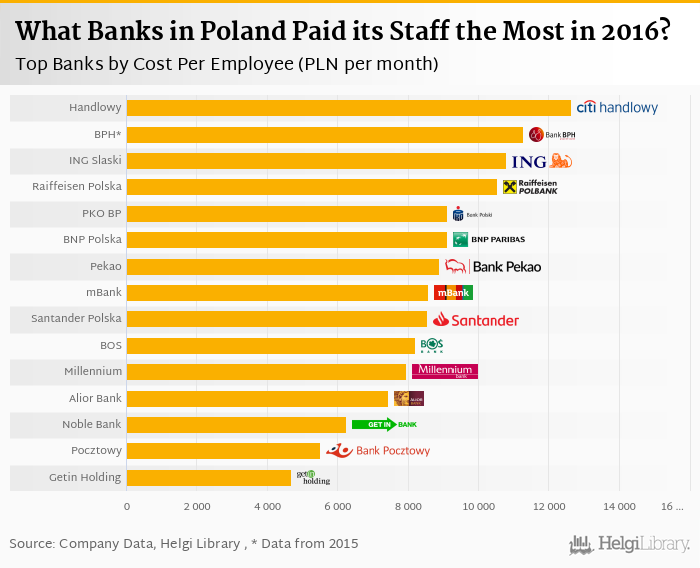 Based on a comparison of 15 banks in Poland in 2016, Bank Handlowy was paying its employees the best, followed by Bank BPH and ING Bank Slaski.