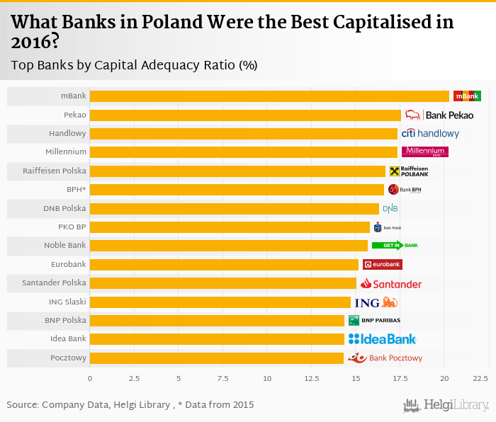 Based on a comparison of 18 banks in Poland in 2016, mBank was the best capitalised bank, followed by Pekao and Bank Handlowy.