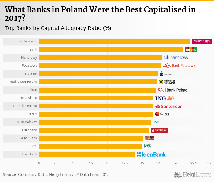 Based on a comparison of 18 banks in Poland in 2017, Bank Millennium was the best capitalised bank, followed by mBank and Bank Handlowy.