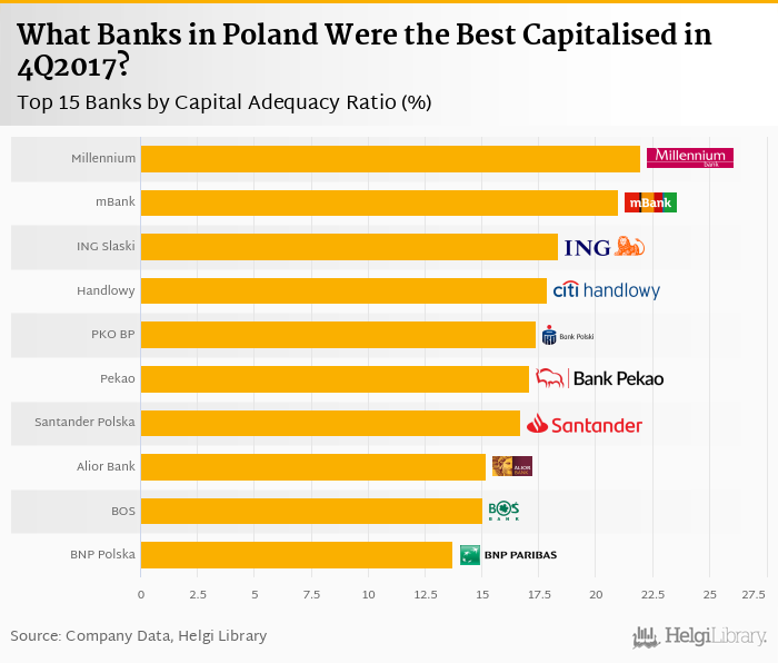 Based on a comparison of 11 banks in Poland in 4Q2017, Bank Millennium was the best capitalised bank, followed by mBank and ING Bank Slaski.