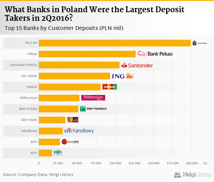 Based on a comparison of 11 banks in Poland in 2Q2016, PKO BP was the largest deposit taker, followed by Pekao and Santander Bank Polska.