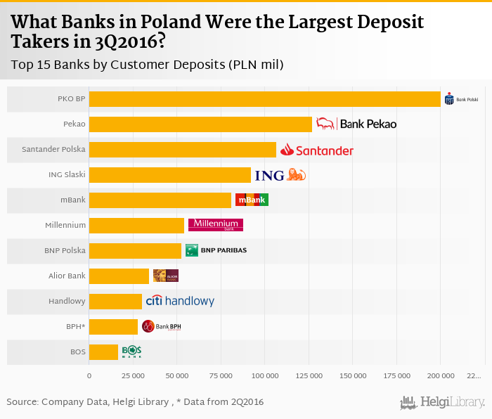 Based on a comparison of 11 banks in Poland in 3Q2016, PKO BP was the largest deposit taker, followed by Pekao and Santander Bank Polska.