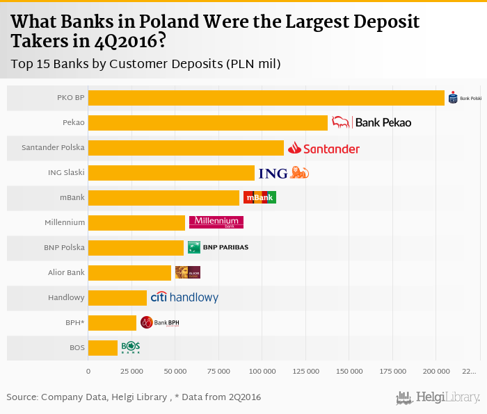 Based on a comparison of 11 banks in Poland in 4Q2016, PKO BP was the largest deposit taker, followed by Pekao and Santander Bank Polska.
