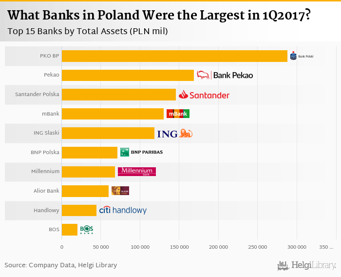 Based on a comparison of 11 banks in Poland in 1Q2017, PKO BP was the largest bank by assets, followed by Pekao and Santander Bank Polska.