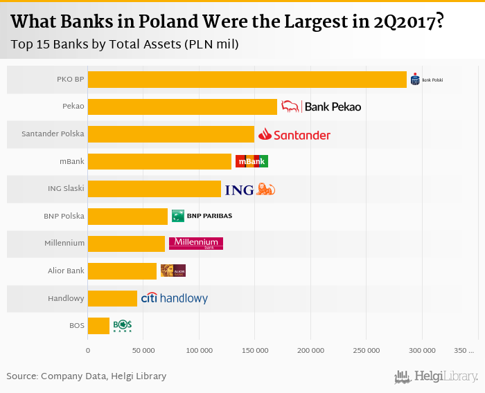 Based on a comparison of 11 banks in Poland in 2Q2017, PKO BP was the largest bank by assets, followed by Pekao and Santander Bank Polska.