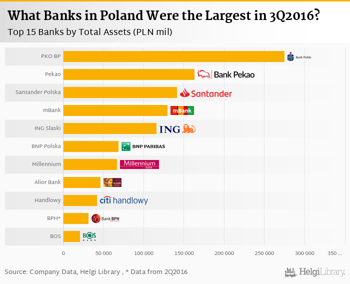 Based on a comparison of 11 banks in Poland in 3Q2016, PKO BP was the largest bank by assets, followed by Pekao and Santander Bank Polska.