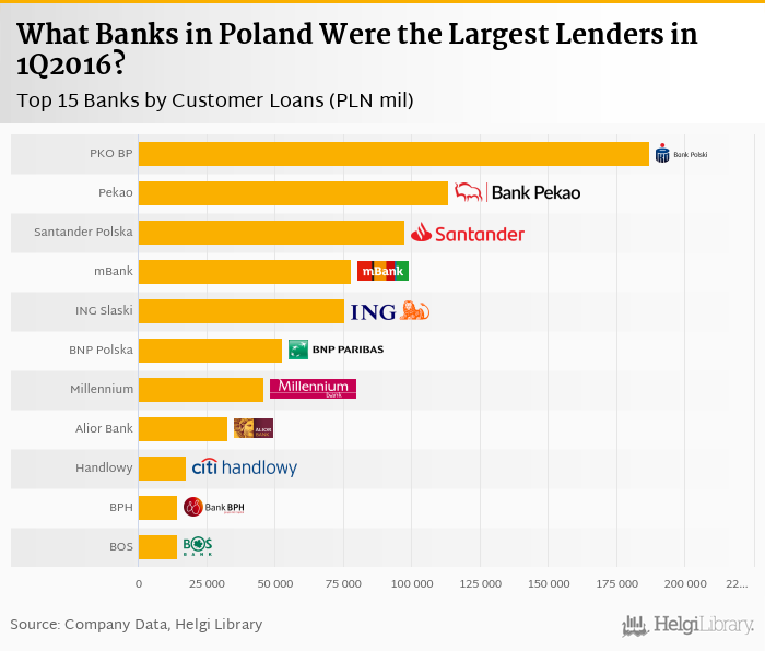 Based on a comparison of 11 banks in Poland in 1Q2016, PKO BP was the largest lender, followed by Pekao and Santander Bank Polska.