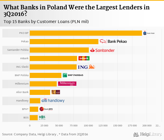 Based on a comparison of 11 banks in Poland in 3Q2016, PKO BP was the largest lender, followed by Pekao and Santander Bank Polska.