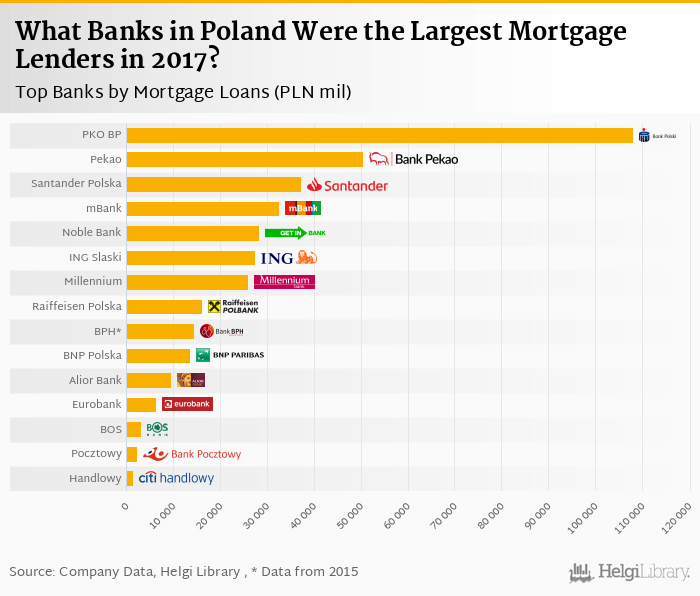 Based on a comparison of 16 banks in Poland in 2017, PKO BP was the largest mortgage lender, followed by Pekao and Santander Bank Polska.
