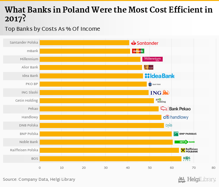 Based on a comparison of 18 banks in Poland in 2017, Santander Bank Polska was the most cost efficient bank, followed by mBank and Bank Millennium.