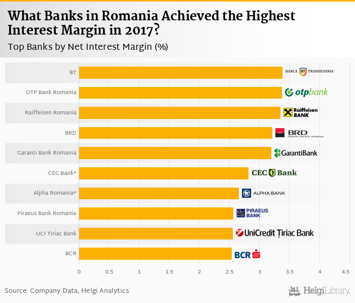 Based on a comparison of 10 banks in Romania in 2017, Banca Transilvania operated with the highest net interest margin, followed by OTP Bank Romania and Raiffeisen Bank Romania.