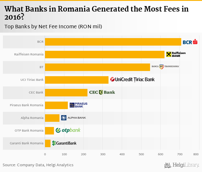 Based on a comparison of 10 banks in Romania in 2016, Banca Commerciala Romana generated the largest fee income, followed by Raiffeisen Bank Romania and Banca Transilvania.