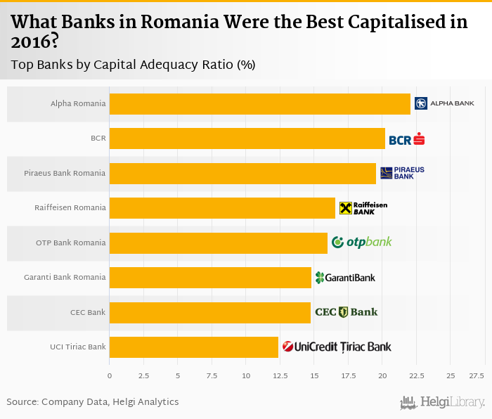 Based on a comparison of 10 banks in Romania in 2016, Alpha Bank Romania was the best capitalised bank, followed by Banca Commerciala Romana and Piraeus Bank Romania.