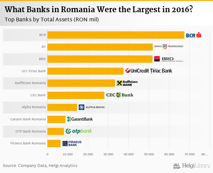 Based on a comparison of 10 banks in Romania in 2016, Banca Commerciala Romana was the largest bank by assets, followed by Banca Transilvania and BRD Groupe Societe Generale.