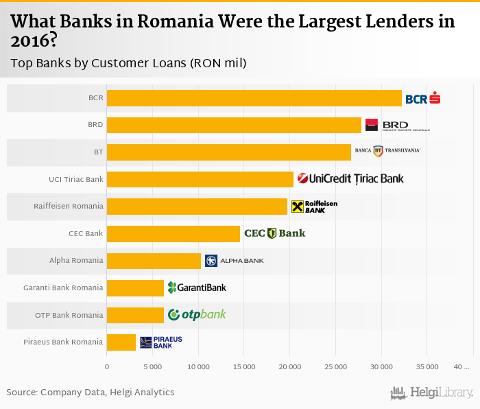 Based on a comparison of 10 banks in Romania in 2016, Banca Commerciala Romana was the largest lender, followed by BRD Groupe Societe Generale and Banca Transilvania.