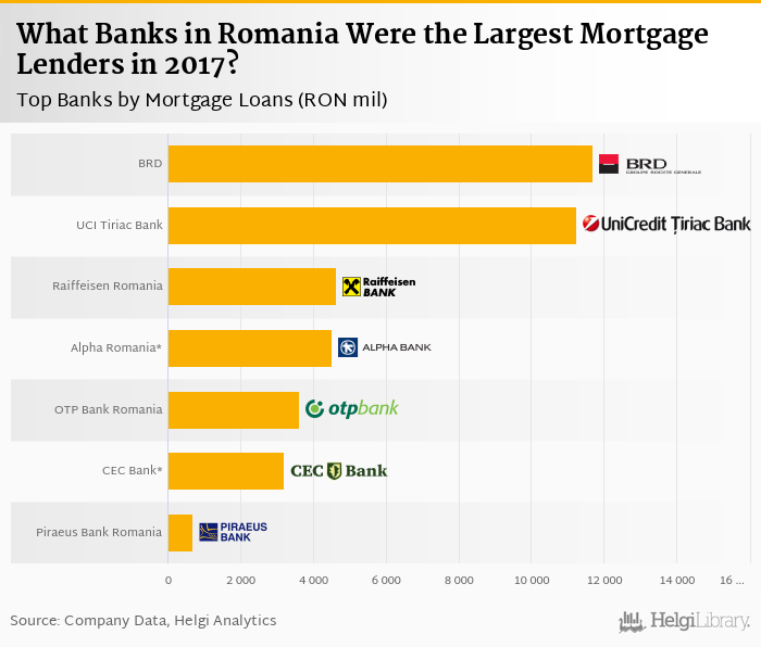Comparing BRD Groupe Societe Generale with its closest peers, UniCredit Tiriac Bank's mortgage loans amounted to RON 11,254 mil at the end of 2017, Raiffeisen Bank Romania operated with RON 4,622 mil mortgage loans and Alpha Bank Romania had a mortgage loan book of RON 4,510 mil at the end of 2017.