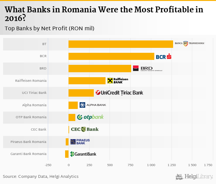 Based on a comparison of 10 banks in Romania, Banca Transilvania produced the highest net profit in 2016, followed by Banca Commerciala Romana and BRD Groupe Societe Generale.