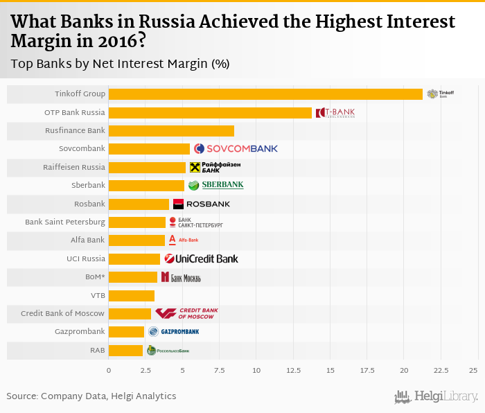 Based on a comparison of 19 banks in Russia in 2016, Tinkoff Group operated with the highest net interest margin, followed by OTP Bank Russia and Rusfinance Bank.