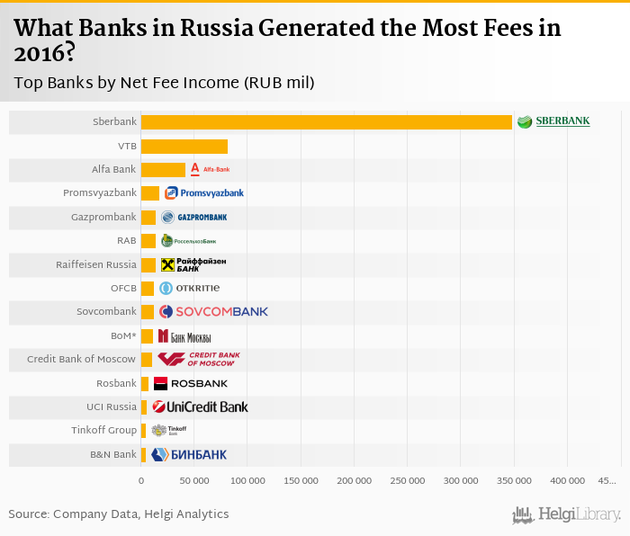 Based on a comparison of 19 banks in Russia in 2016, Sberbank generated the largest fee income, followed by VTB Bank and Alfa Bank.