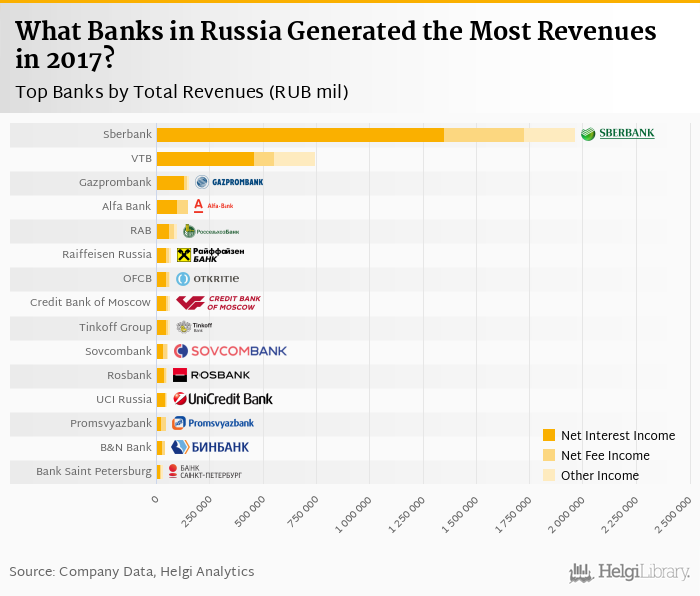 Based on a comparison of 19 banks in Russia in 2017, Sberbank generated the largest revenues, followed by VTB Bank and Gazprombank.