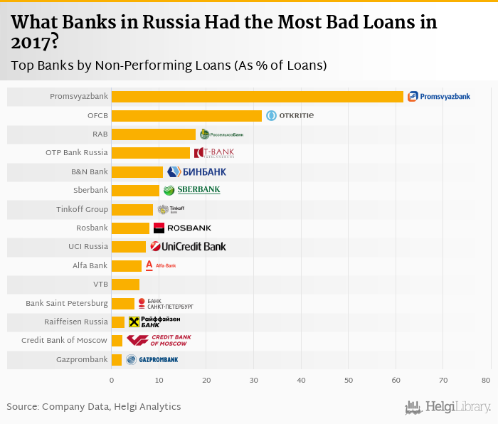 Based on a comparison of 18 banks in Russia in 2017, Promsvyazbank had the highest share of bad loans, followed by Otkritie Financial Corporation Bank and Russian Agricultural Bank.