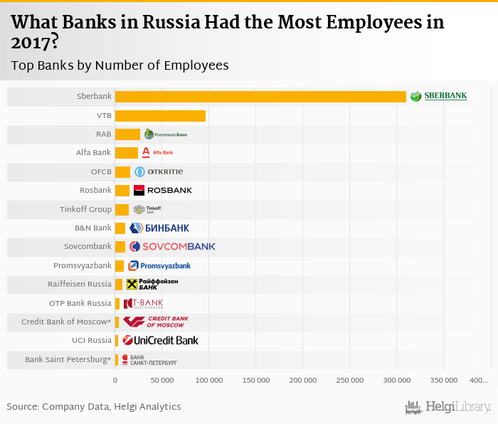 Based on a comparison of 18 banks in Russia in 2017, Sberbank had the most employees, followed by VTB Bank and Russian Agricultural Bank.
