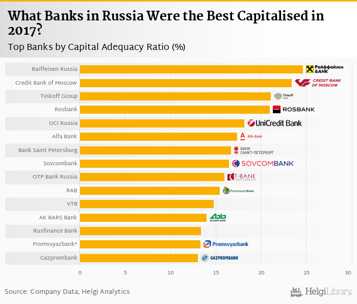 Based on a comparison of 19 banks in Russia in 2017, Raiffeisenbank Russia was the best capitalised bank, followed by Credit Bank of Moscow and Tinkoff Group.
