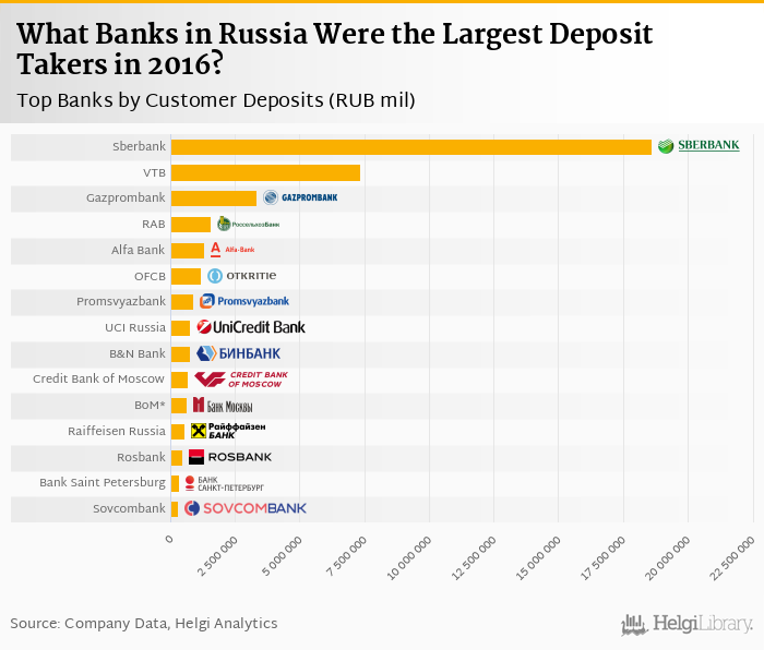 Based on a comparison of 19 banks in Russia in 2016, Sberbank was the largest deposit taker, followed by VTB Bank and Gazprombank.