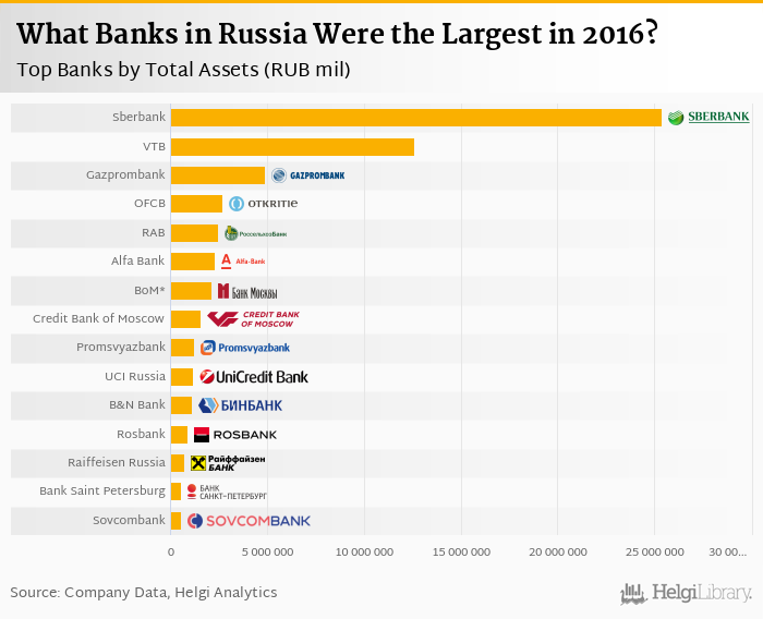 Based on a comparison of 19 banks in Russia in 2016, Sberbank was the largest bank by assets, followed by VTB Bank and Gazprombank.