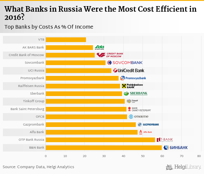 Based on a comparison of 19 banks in Russia in 2016, VTB Bank was the most cost efficient bank, followed by AK BARS Bank and Credit Bank of Moscow.