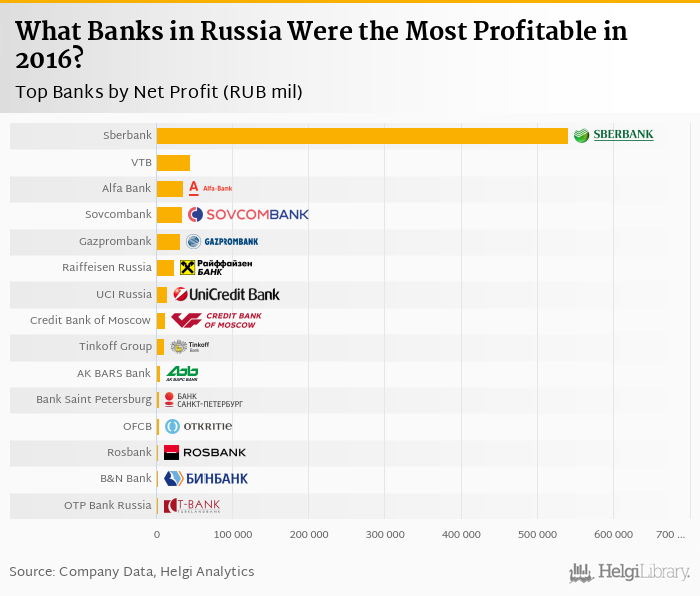 Based on a comparison of 19 banks in Russia, Sberbank produced the highest net profit in 2016, followed by VTB Bank and Alfa Bank.